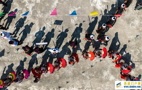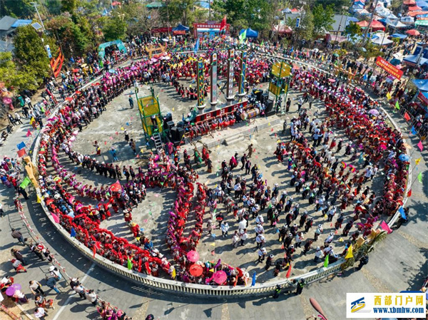 3月2日,当地群众与来自各地的游客踩着相同的鼓点进场舞蹈(无人机照片)。