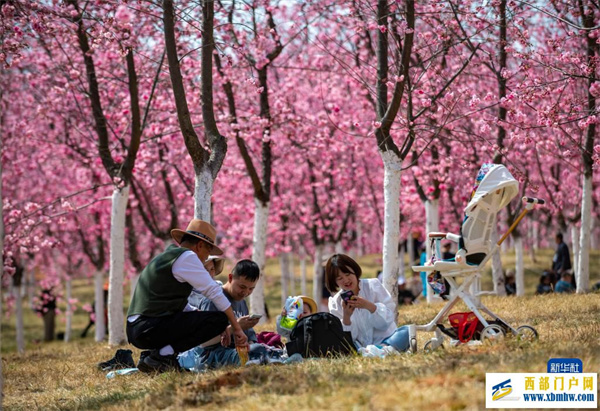 3月1日,两名游客在宜良县山后樱花谷观光直播。